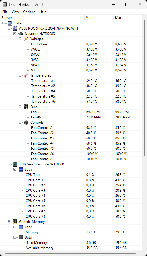 In een eerder bericht is al aangegeven dat er iets schort aan de hardware. Met behulp van de Task Manager van Microsoft bleek namelijk dat de CPU overbelast zou zijn. Gisteren een andere hardware monitor op de sim PC geïnstalleerd en deze vandaag mee laten draaien tijdens het vliegen. Hieruit blijkt dat de CPU absoluut niet het knelpunt is. Als ik alleen op de cijfers van Microsoft was afgegaan, dan zou ik voor Jan met de korte achternaam heel veel geld hebben uitgegeven.