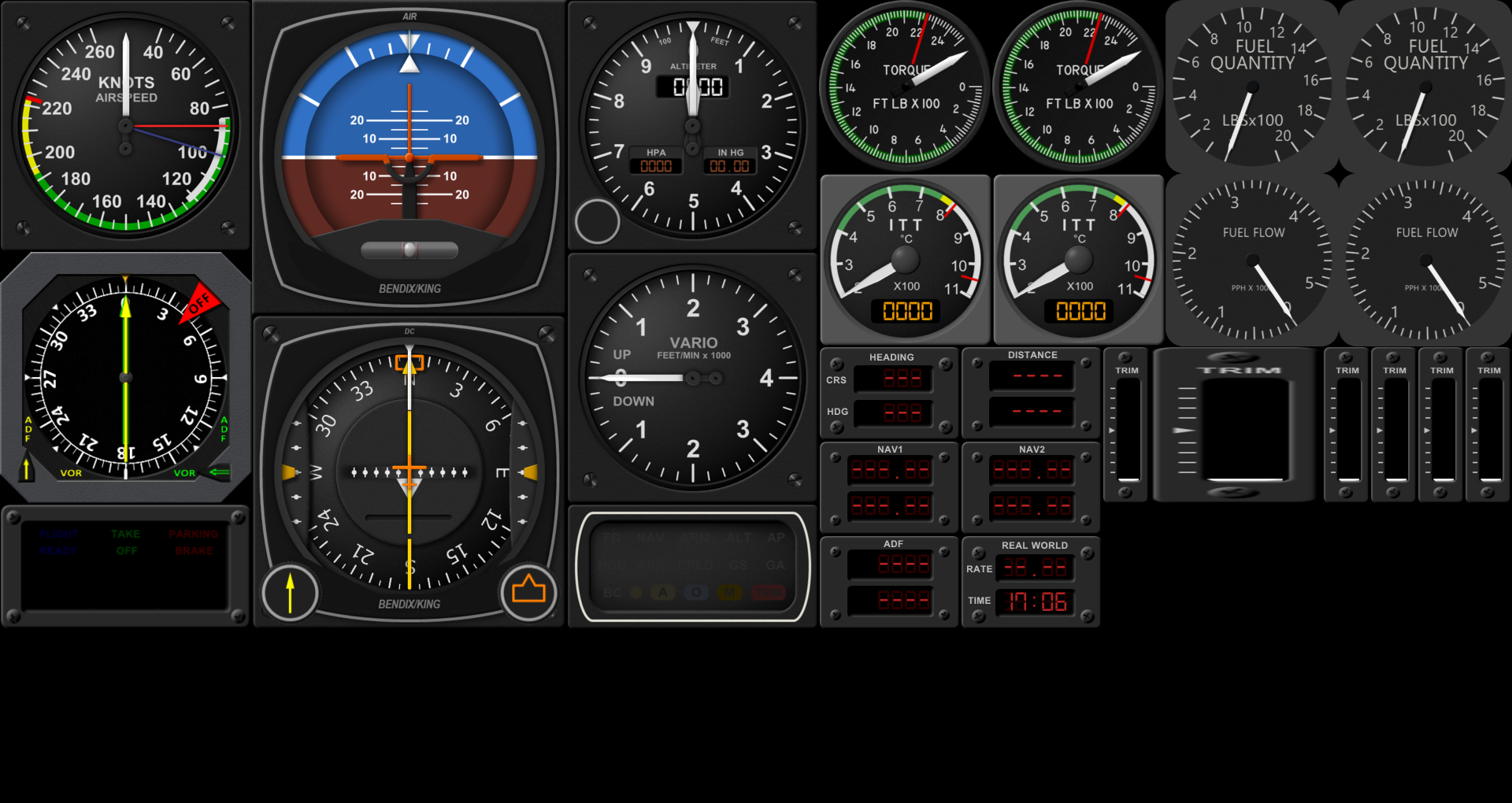 Uitgaande van deze maten is er een eerste ontwerp gemaakt. Hierbij zijn steeds reeds bestaande klokken gebruikt vandaar dat het er niet echt als één geheel uitziet. Rechtsonder zijn zes “Trim” meters aangebracht, de functie is van links naar rechts: trim, flaps (met hendel en actuele stand), throttle links en rechts en prop links en rechts.