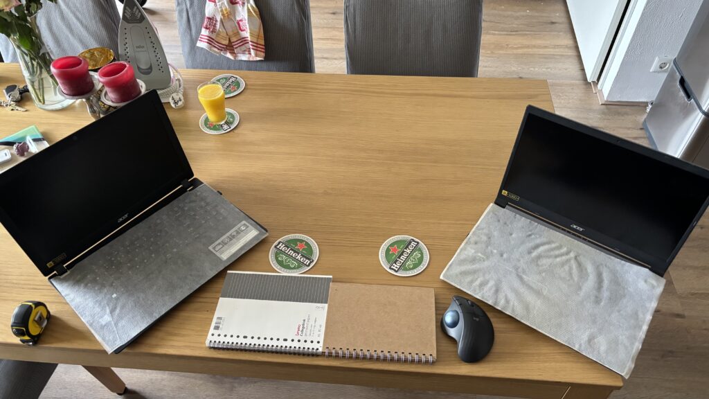 De laptops komen aan alle kanten iets over de rand van de nieuwe vliegplank te hangen, maar dat is op zich geen probleem. De laptops staan er in feite alleen voor het weergeven van beeldinformatie. De toetsenborden van de laptops gaan niet gebruikt worden omdat alles met Input Director wordt geregeld.